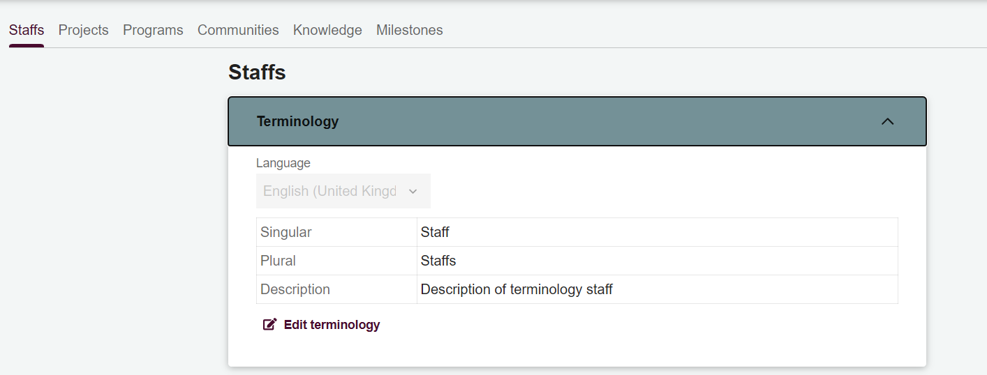 - Navigate to the entity where you want to update terminology. In this example, we'll locate and update the Staff entity.