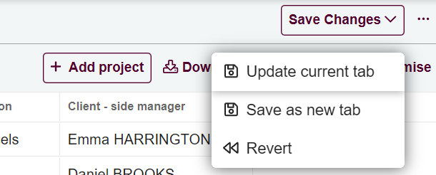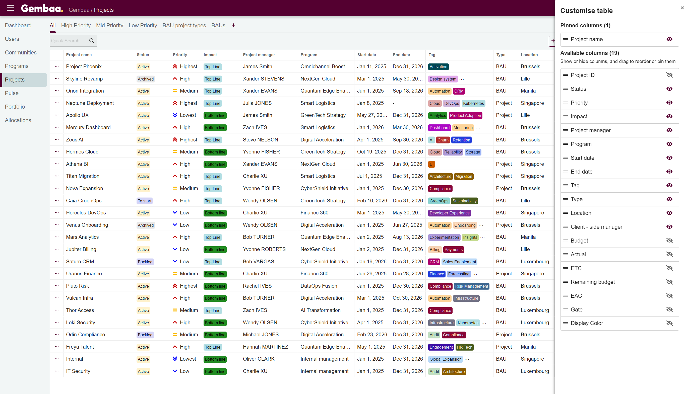- Hide or unhide columns – control which project fields are visible in the table using the 👁 icon