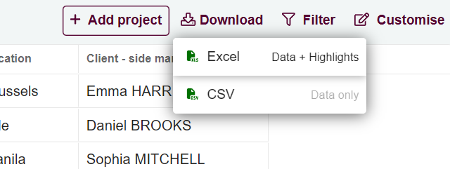 Export project data to Excel/CSV