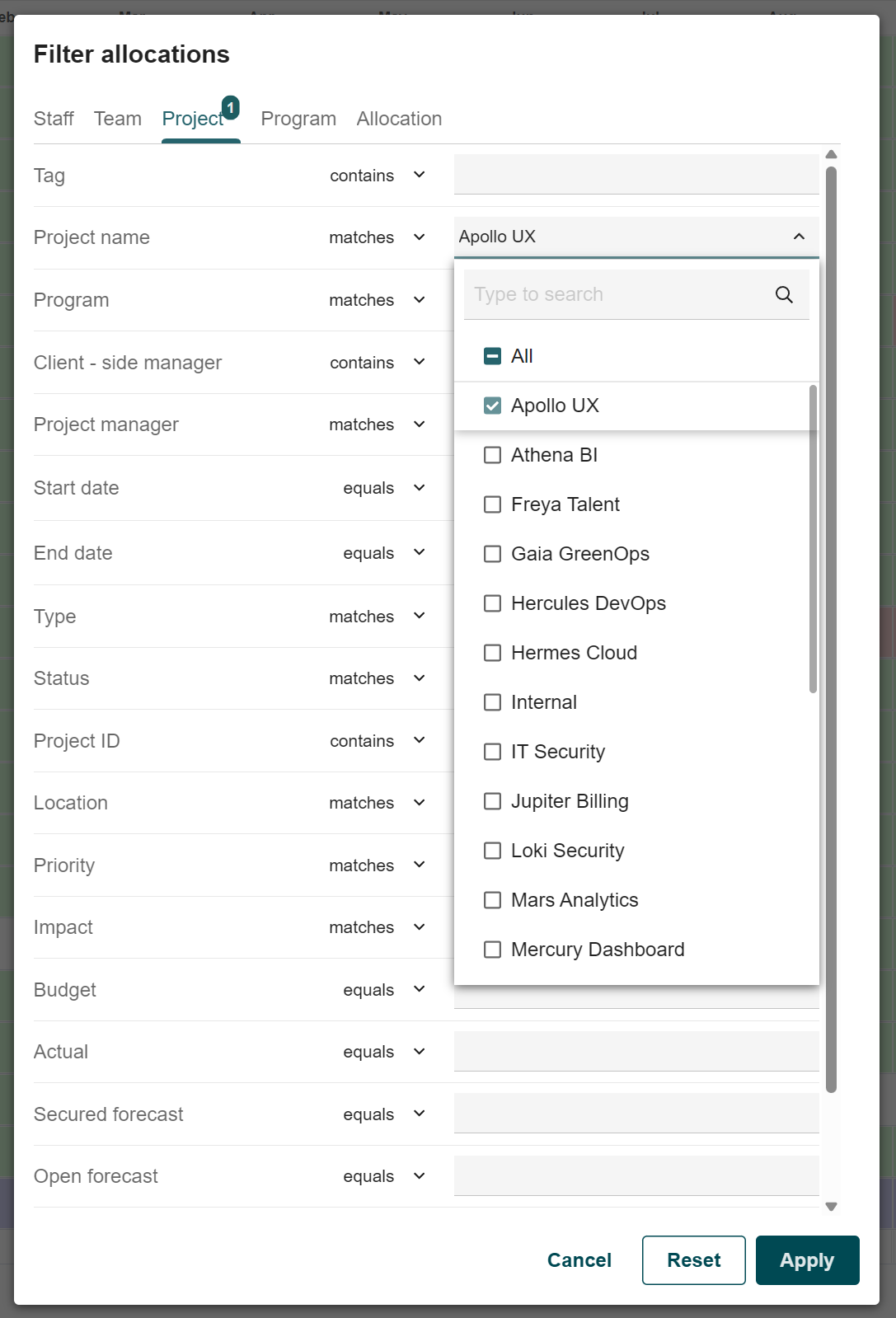 - Narrow down allocation data to focus on specific staff, team, project, program, or allocation