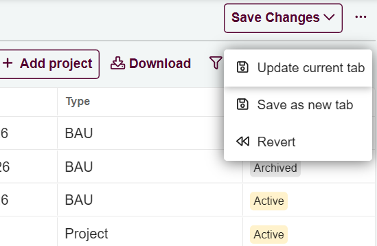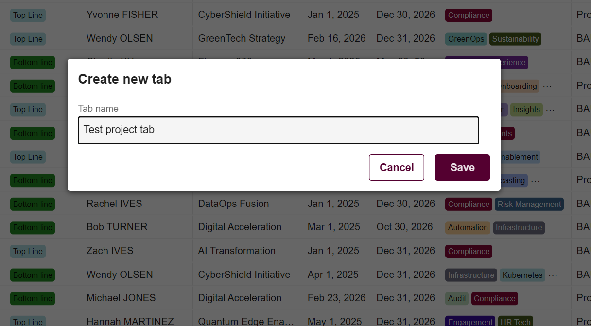 Create, save, and manage custom tabs to maintain personalized Projects table views for easier navigation and reporting.